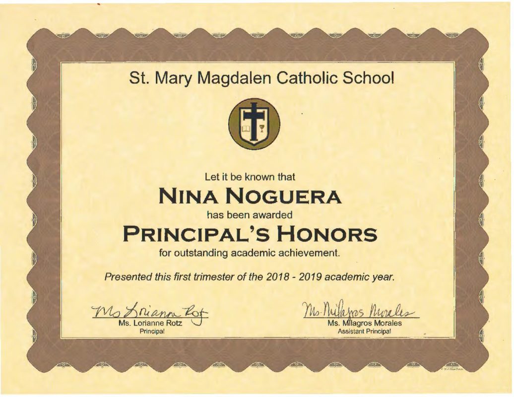 * Nina recibió el “Principal’s Honors Certificate” por su sobresaliente desempeño academico en el primer trimester del año escolar 2018-2019″