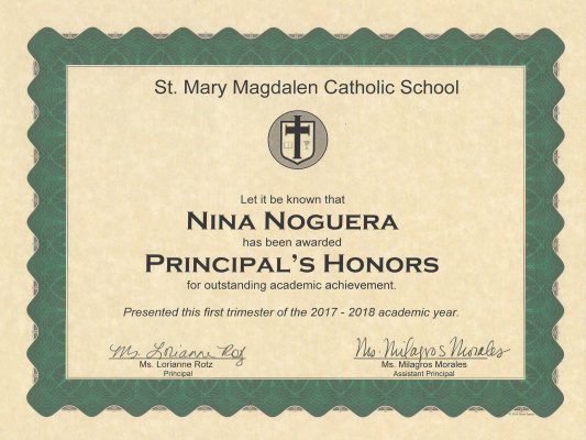 Nina recibió el premio de "Principal’s Honor" por su destacado desempeño académico durante el primer trimester del año escolar.